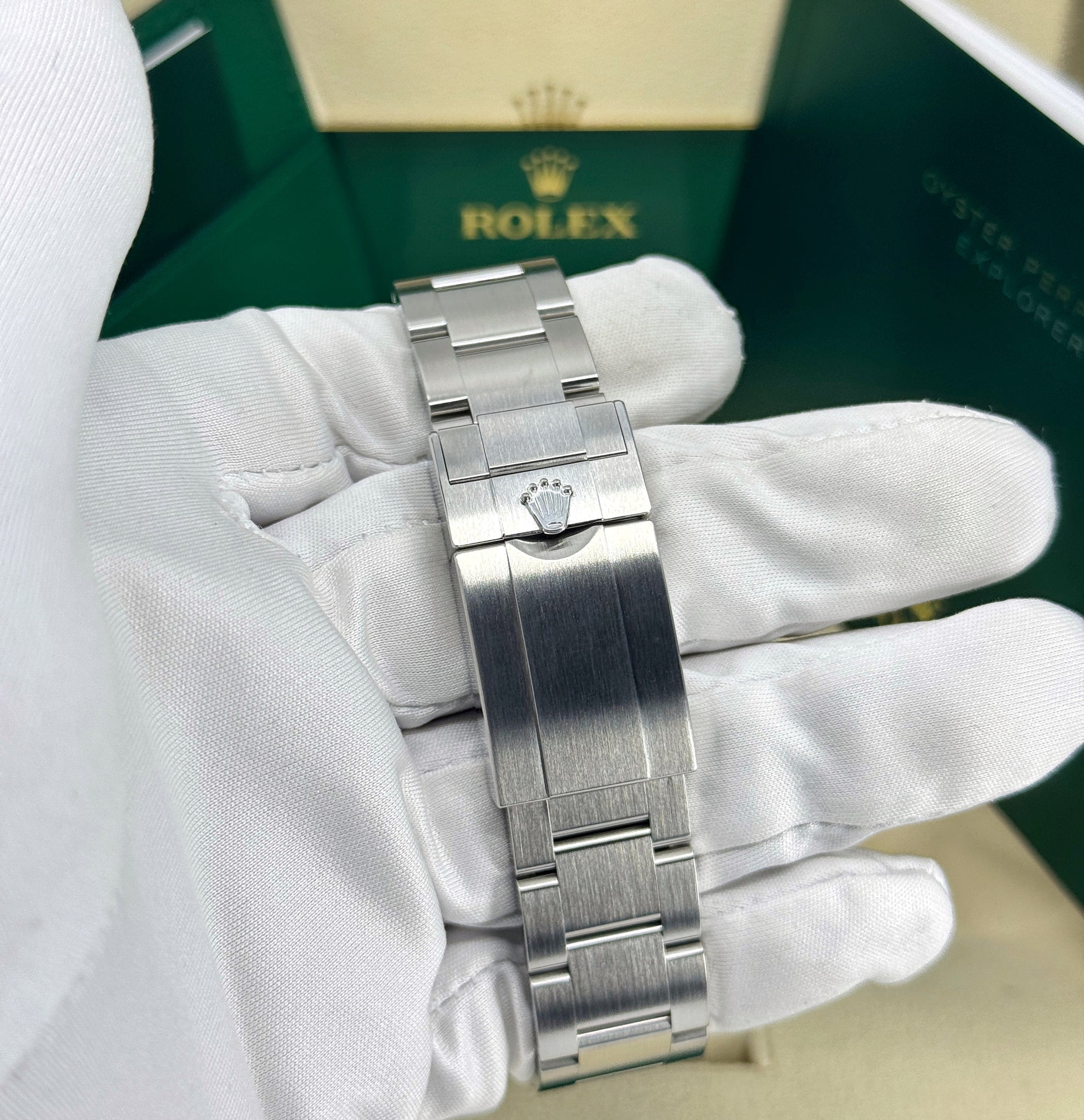 This watch is Unworn and comes complete with the original box, booklets, green tag, and warranty card. Please note that it doesn't come with the white serial tag or bezel protector, which were removed upon purchasing from the Rolex Authorized Dealer. The watch is fully linked with the standard amount of the Rolex links. If necessary, bracelet can be sized by buyer's request.